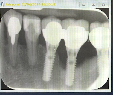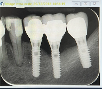 Examen radiologique: alvéolyse horizontale et perte osseuse au niveau de l'implant 36.